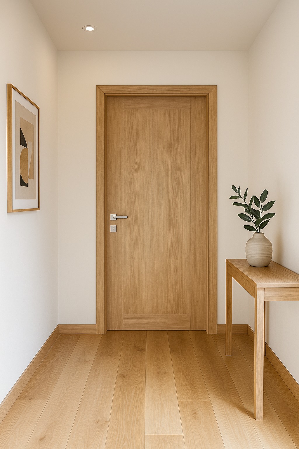 Javier y Núria acaban de reformar su piso en la zona de Sants, en Barcelona. Querían renovar las viejas puertas de madera oscura y conseguir un estilo más actual sin renunciar a la resistencia y al fácil mantenimiento. Nos pidieron instalar puertas laminadas en acabado roble claro, con líneas rectas y un diseño atemporal.
