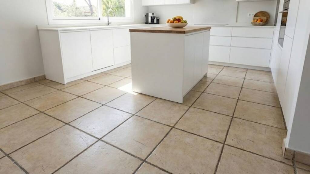 La cocina es el corazón de esta vivienda unifamiliar en Sant Cugat del Vallès, pero se había quedado atrapada en los años 90. El suelo original era una baldosa cerámica de color beige con juntas anchas y ennegrecidas por el tiempo. Aunque los muebles de la cocina estaban en buen estado y eran de calidad, el suelo hacía que todo el conjunto pareciera viejo y descuidado.